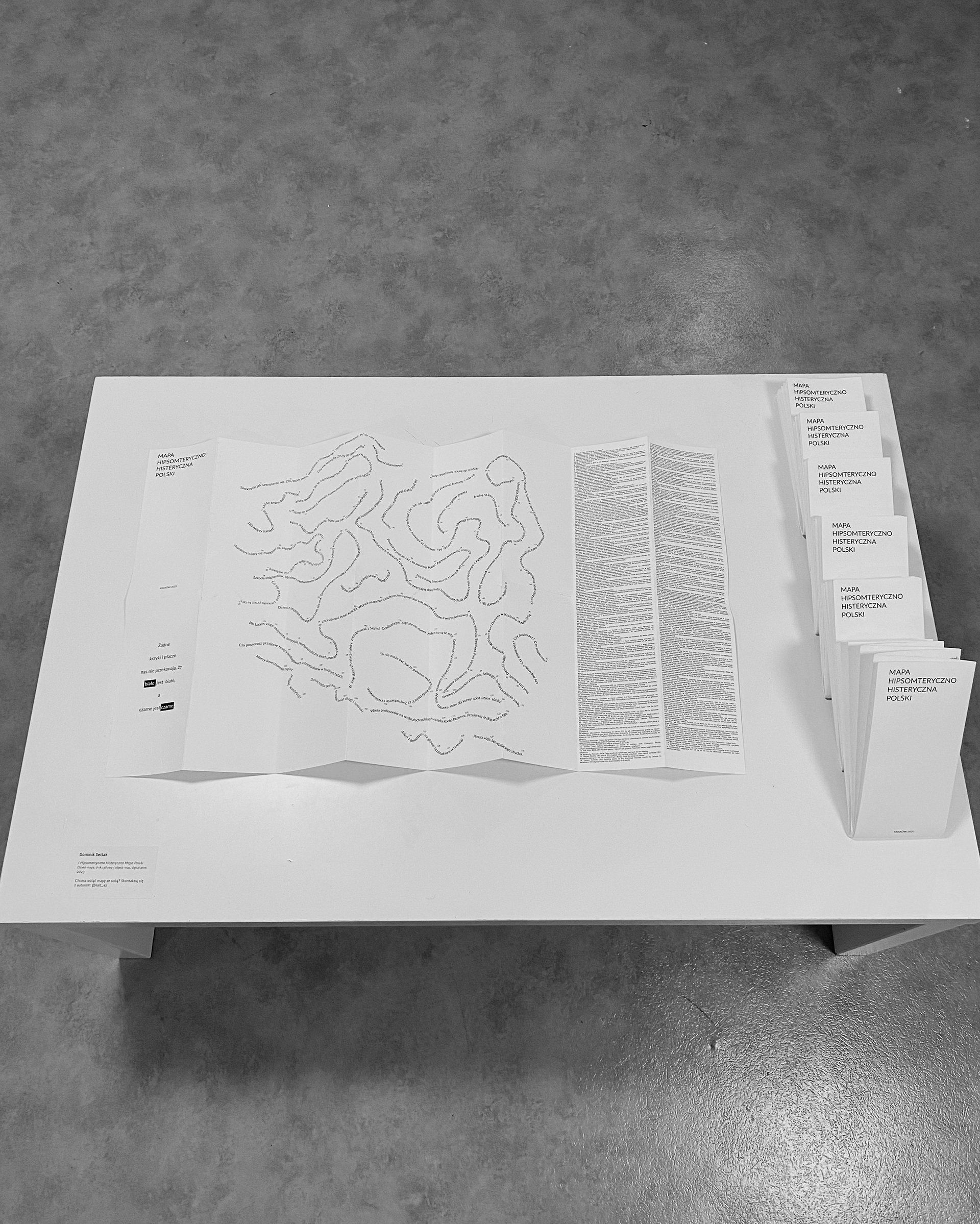 Czy mapa może być jedynie wybranym zestawem zdań i słów jakie mogą dotyczyć ogólnie kultury słowa pomiędzy zasiedlającymi dany obszar autochtonami? Czy dobór zdań i słów pochodzący z obszaru Polski – sposób wyrażania się, akcentowania – mogą pokazać skalę zjawiska w wiarygodny sposób? Co jest legendą do takiej mapy? Jak się po niej poruszać? „Hipsometryczna Histeryczna Mapa Polski” jest do „przeczytania” i zobaczenia w ramach wystawy „Na styku 3”.